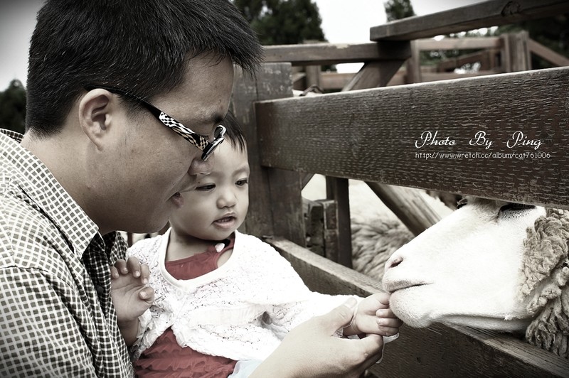老公和SinYu正在餵食羊咩咩飼料,又怕又喜呢。
